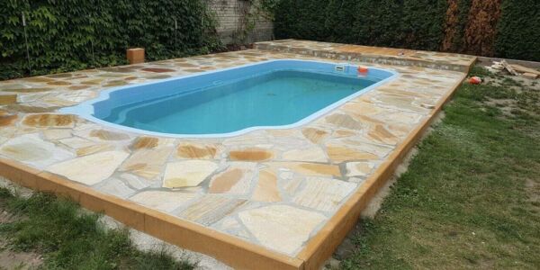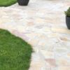 Polygonalplatten Gelb „Rio“, weiche Farbtöne mit wechselnden Gelbtönen über weiß bis zu smarten Ockertönen, Durchmesser: ca. 20-60 cm, Stärken: 0,8-1,5 und 1,5-2,5 und 2,5-4 cm (Varianten) – Im Außenbereich spielen die warmen Sonnenstrahlen mit dem Material und lassen die Farben lebhaft ineinander übergleiten. Erleben Sie höchste Qualität verbunden mit Eleganz und Exklusivität. Die Oberfläche ist spaltrau, die Kanten sind gebrochen. Unsere Kunden nutzen diese Polygonalplatten bevorzugt für die Terrasse und Ihre individuelle Poolumrandung. Sie sind rutschhemmend und trotzdem auch barfuß angenehm zu begehen. Wir beziehen diese Terrassenplatten aus Brasilien.